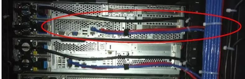 不同線纜用不同顏色的線區(qū)分,如內網線:藍色,ILO線:灰色,電源線:黑色,預留的線纜長度不宜過長,能從一側PDU到另外一側PDU即可,預留過長線纜會對理線造成影響。上下兩臺服務器之間布線及捆綁要求如下圖:(因網線有電磁干擾,要做到強弱分開,電源線與網線要分開捆扎)