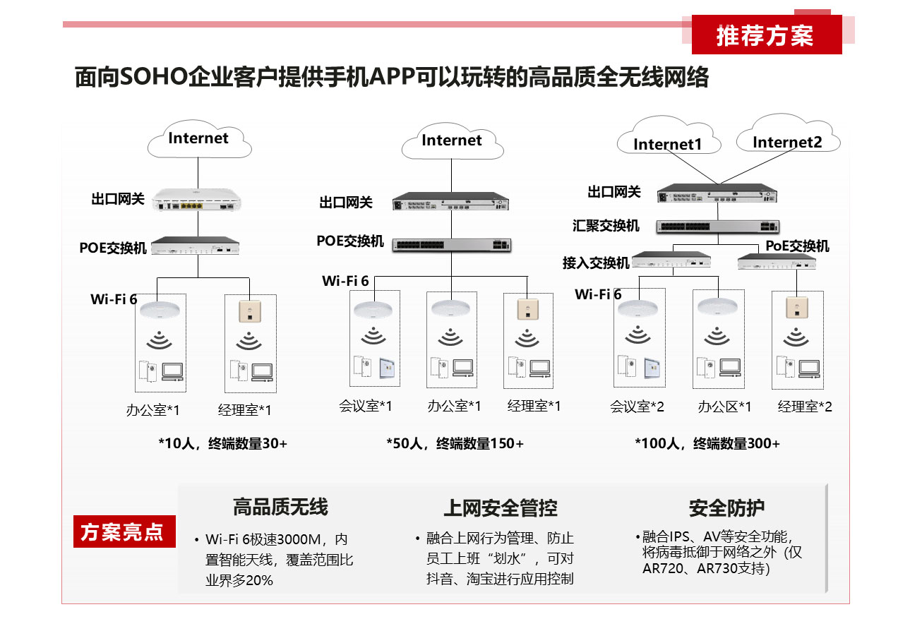 SOHO企業(yè)常面臨網(wǎng)絡(luò)覆蓋不均、安全性低及管理復(fù)雜等問題。我們推出的SOHO場景化套餐,針對寫字樓、創(chuàng)業(yè)園區(qū)和電腦城等不同場景,提供定制化無線網(wǎng)絡(luò)解決方案。采用Wi-Fi 6技術(shù),配備智能天線,提升信...