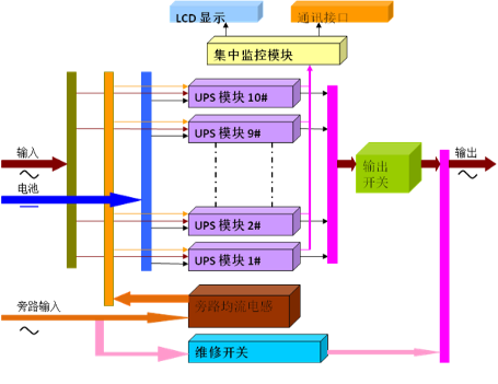 如圖所示:YMK系列UPS為模塊化設(shè)計(jì),整機(jī)采用集中監(jiān)控,每個(gè)模塊間并機(jī)運(yùn)行,且每個(gè)模塊集成旁路、整流、逆變單元。模塊間可以任意設(shè)置主用模塊數(shù)和備用模塊數(shù),例如整機(jī)配置10個(gè)模塊,可配置為主用8個(gè)模塊,備用2個(gè)模塊。